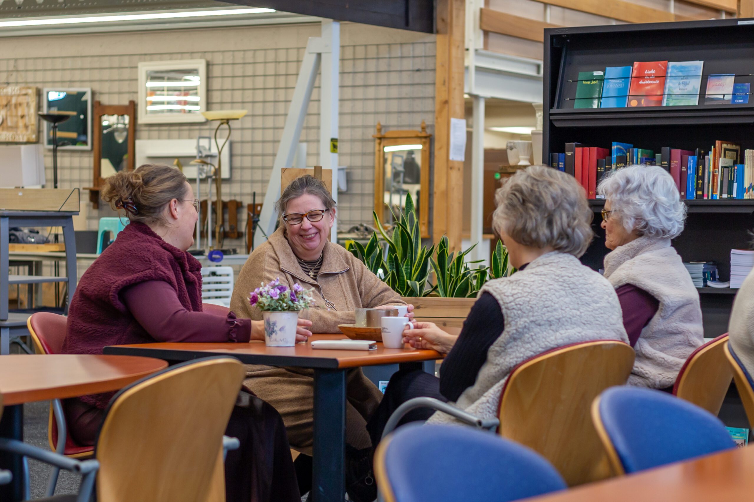 In de winkel is een gezellige koffiehoek ingericht voor bezoekers die van ver komen, maar ook voor hen uit de nabije omgeving.